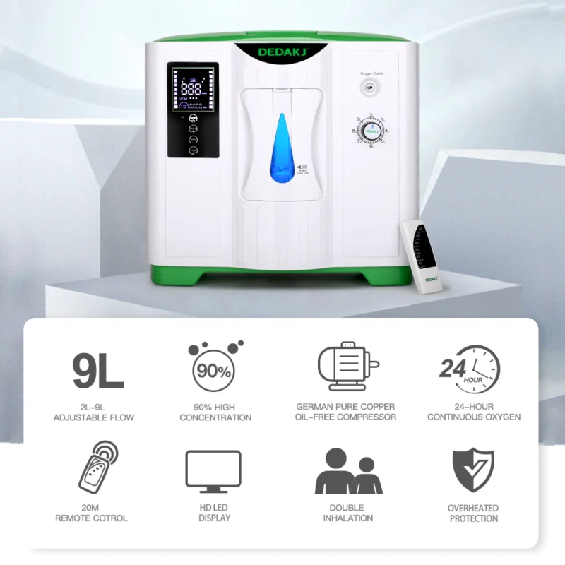 Máy tạo oxy DEDAKJ 9 lít là dòng máy tạo oxy gia đình với thiết kế nhỏ gọn, dễ mang đi lại, và dễ sử dụng. mang lại nguồn oxy chất lượng cao, hỗ trợ người bệnh bị thiếu hụt oxy trong máu, để cho người bệnh có những giờ phút thư giãn, tận hưởng cuộc sống trong lành. Máy tạo Oxy DEDAKJ DE-2AW 2-9 lít có thiết kế mới thích hợp với nhu cầu sử dụng trong gia đình.
